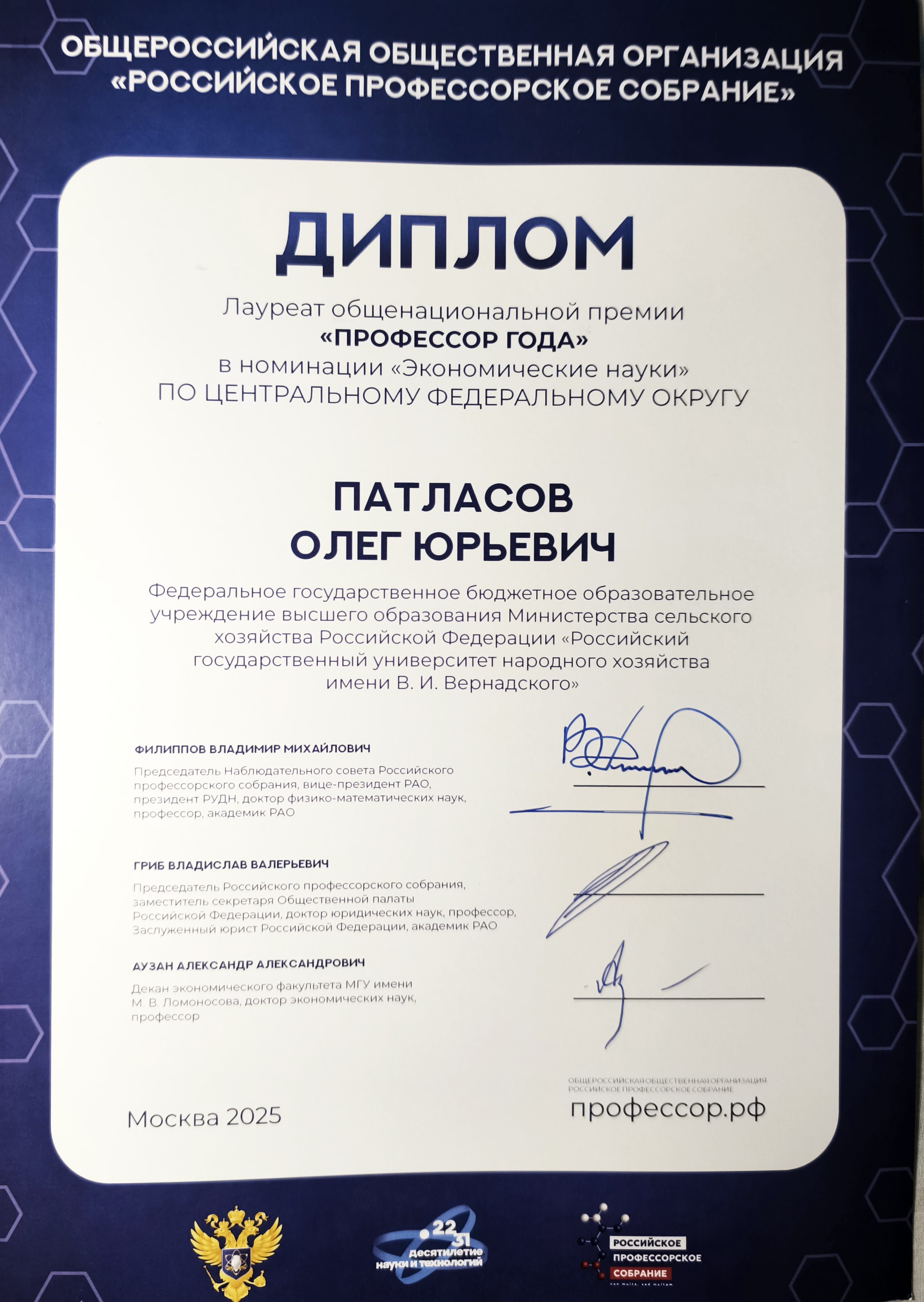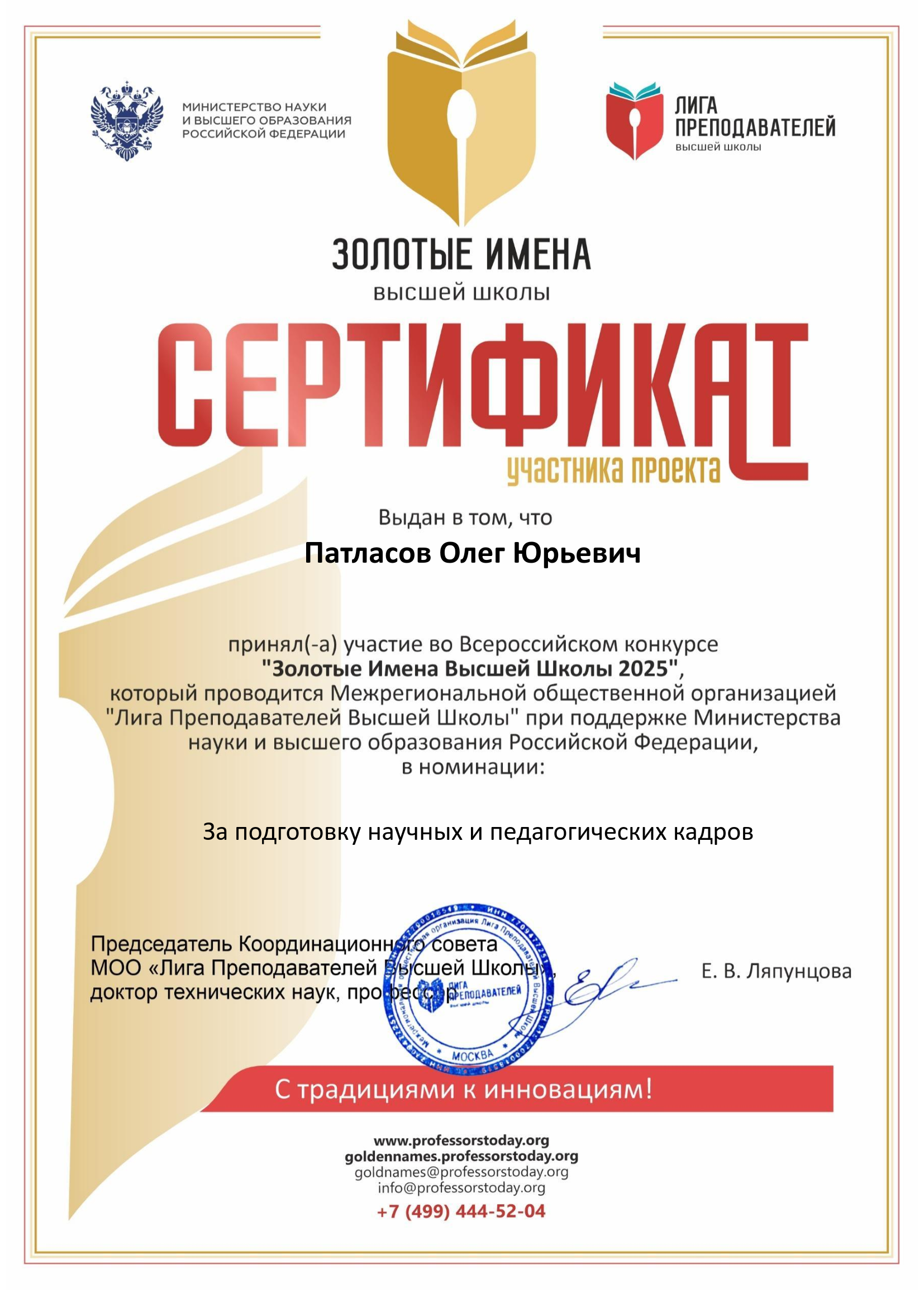 Профессор Патласов О.Ю. в 2025 г. стал Лауреатом общенациональной премии в номинации «Профессор года» (Диплом)