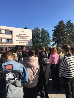 В 9:50 всех студентов колледжа и академии собрали на площади у входа в здание. Проректор по общим вопросам и безопасности Салахов Галимжан Шаукатович рассказал собравшимся участникам о том, как действовать в случае пожара и террористического акта.